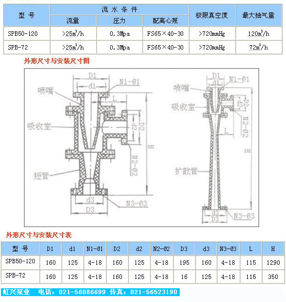 SPB型玻璃鋼水噴射真空泵SPB型玻璃鋼水噴射真空泵是一種具有抽真空、冷凝、排水等三種有效能的機械裝置。它是利用一定壓力的水流通過對稱均布成一定傾斜的噴出。聚合在一個焦點上,由于噴射水流速度很高,于是周圍形成負壓使器室內(nèi)產(chǎn)生真空,另外由于二次蒸氣冷凝成水,少量未被冷凝的蒸氣由與不凝結(jié)的氣體亦由于與高速噴射的水互相摩擦,混合與擠壓,通過擴壓管被排除,使器室內(nèi)形成更高的真空。但目前生產(chǎn)水利噴射器的制造廠較小,品種亦不齊全,為此,我們近年來不斷改進設(shè)計,采用多噴咀與氣環(huán)(導向盤)等結(jié)構(gòu),以及用多級泵進水,低位安裝,吸需安裝高度4.5米,完善與提高了其工作性能,具有一定的先進性,是真空冷凝設(shè)備的一種革新。